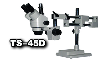 TS-45D配有萬向支架,可擴大操作范圍,任意方向任意角度觀察物體。該顯微鏡具有視場廣闊,分辨率高,立體感強等特點, 可連續變倍。廣泛用于電子精密部件裝配檢修、動物解剖、教學示范、文物郵票輔助鑒別及各種物質表面觀察等。 可配攝影攝像裝置,連接電腦進行觀察,拍照、測量、打印輸出等操作。 總放大倍數:7X-45X